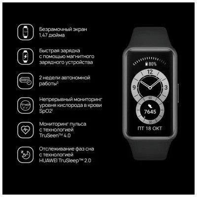 HUAWEI представляет вам поистине масштабное обновление часов серии Band. Большой и яркий экран, набор датчиков здоровья и фитнеса, продолжительная автономность и многое другое к вашим услугам от нового личного гаджета - браслета HUAWEI Band 6.Не всматривайтесь, а просматривайте. AMOLED-экран с диагональю 1,47″ и разрешением 198x368 не может не радовать глаз. С ним вам точно не придётся лишний раз напрягать зрение, чтобы увидеть важную информацию или прочитать уведомление. А внешнее олеофобное жироотталкивающее покрытие всегда сохранит его опрятный вид, стремительно удаляя следы от пальцев.Готовьтесь - в браслете Huawei Band 6 присутствует целых 96 режимов разных тренировок. Достаточно лишь нажать на кнопку «Виджеты» и отметить галочками те тренировки, которые вам нужны: от ходьбы, бега и плавания до танца живота, тайцзы и даже воздушного змея.В Huawei Band 6 также стоит отметить технологии круглосуточного измерения пульса TruSeen 4.0, качества ночного сна и уровня стресса, а также новый замер степени насыщения крови кислородом в режиме реального времени - SpO2. С ними вы сможете делать различные измерения и быть более внимательным к своему здоровью.Браслет Huawei Band 6 способен «протянуть» на целых 14 дней работы в режиме «стандартного использования» и 10 дней - в режиме «интенсивного использования». При необходимости его всегда можно стремительно зарядить всего за полчаса, чтобы потом активно использовать их целую неделю и больше.